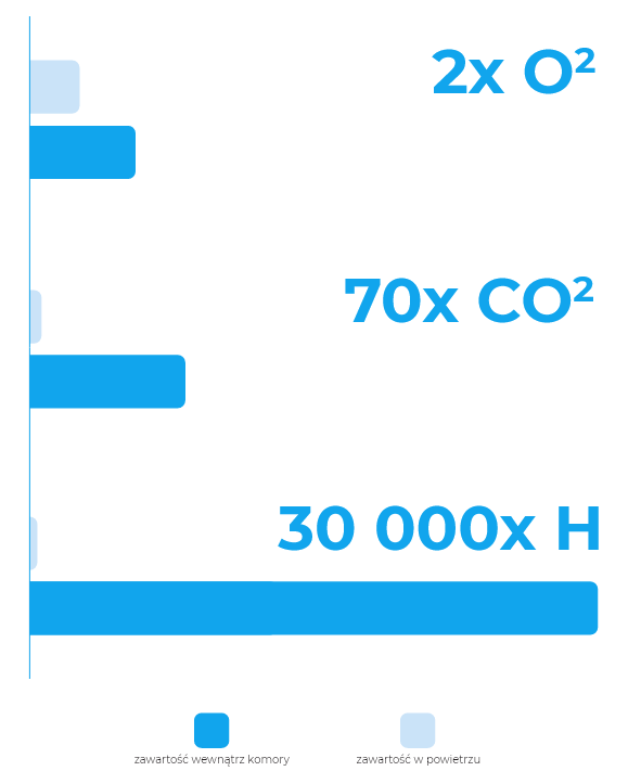 - zastosowanie lamp w komorze o dł. Fali 660 nm., zwiększa aktywność mitochondriów, poprawia wymianę tlenową o 15-20 % na poziomie komórkowym